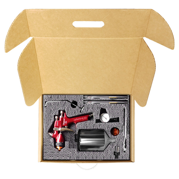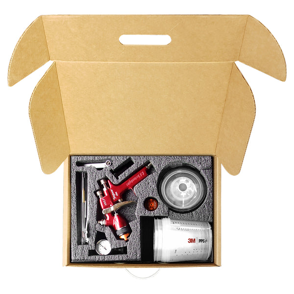 - The L100H HVLP Gravity Feed Spray Gun CAT Packs include two air caps (1090 – 6 cfm & 1093 - 10 cfm) along with several different needle and nozzle sizes, (Woodworking Kit - 1.0 mm, 1.4 mm, 1.5 mm & 1.7 mm or Automotive Kit – 1.3 mm, 1.5 mm & 1.7 mm), mini spray gun regulator, multi-purpose wrench, ratchet wrench with 3/8” socket, cleaning brush and your choice of 700 ml aluminum cup or the 3M PPS Cup System with a 650 ml gravity feed cup (liners & lids sold separately) all contained in a handy carrying case.